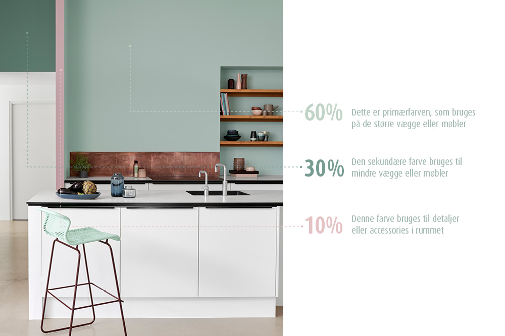 Derfor har vi udviklet et farvesystem, som du kan anvende som værktøj, når du skal indrette din bolig med farver. Farvesystemet hjælper dig med at skabe farveharmoni i din indretning - ligegyldigt hvilke og hvor mange farver du ønsker at omgive dig med. I al sin enkelhed er farvesystemet en vejledning i procentvis vægtningen af brugen af forskellige farver. Farvesystemet er udviklet efter et princip vi kalder "60-30-10".