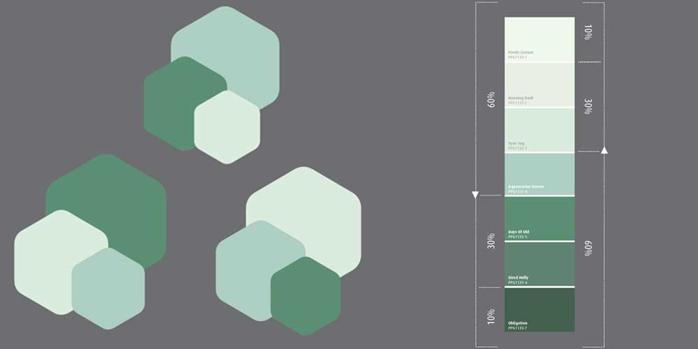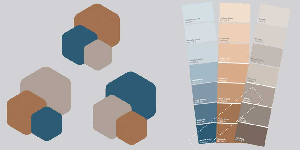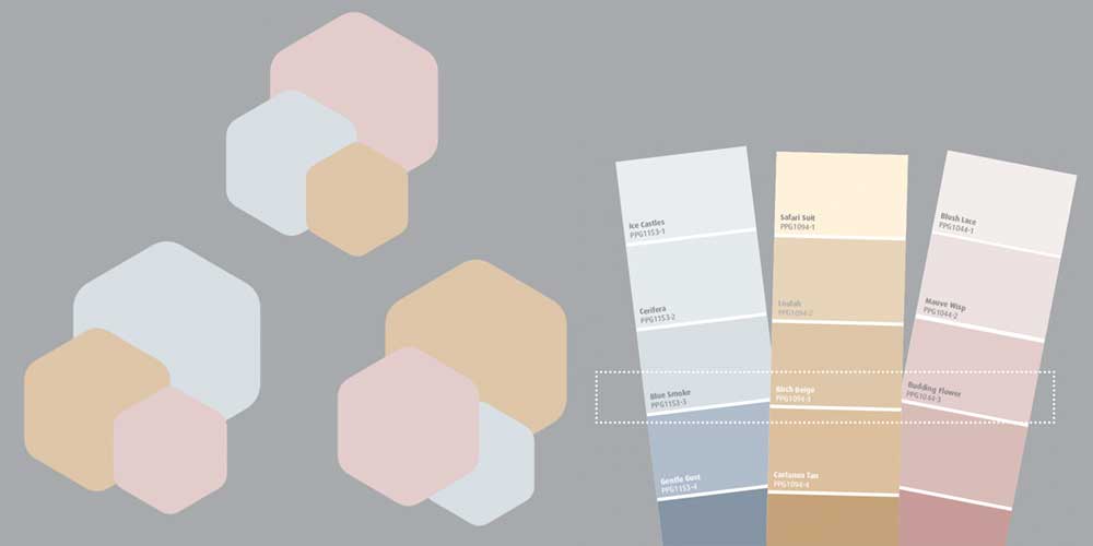 Til et farverigt, men stadig harmonisk udtryk, kan du frit vælge tre farver på kryds og tværs i farveviften. De kan have forskellige farver og styrker. Styrken ses på slutnummeret i farvekoden efter bindestregen fx Talavera PPG1018-5, Wave Of Mystery PPG1148-7 og Gingercake PPG1069-7. På de tre farvesammensætnings eksempler kan du se, hvordan udtrykket med de 3 farver ændrer karakter alt efter hvilken farve der fylder mest - altså fordelingen på henholdsvis 60%, 30% og 10%. De samme tre farver kan med andre ord både spænde fra et mørkt udtryk til et helt lyst udtryk.