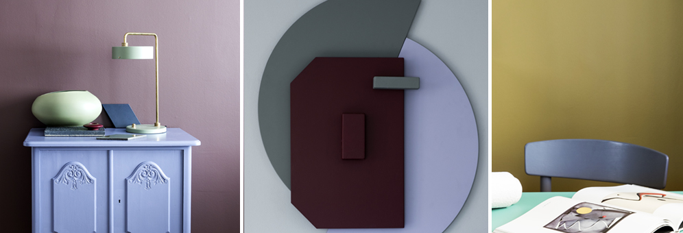 Børn elsker farver, og børneværelset er derfor ofte det rum i boligen, hvor der er flest farver i indretningen. På børneværelset kan du virkelig slippe fantasien løs. Mal væggene i forskellige farver, mal mønstre på væggene, eller lav et farvetema på værelset, så vægge og møbler er malet i eksempelvis 5 forskellige nuancer af lilla. På billedet nedenfor er den mørkeste blå er Ceto, den lyse blå hedder Calm Voyage, den nederste lyserøde hedder Carli Carnation og den lilla hedder Sumptuous Suede.