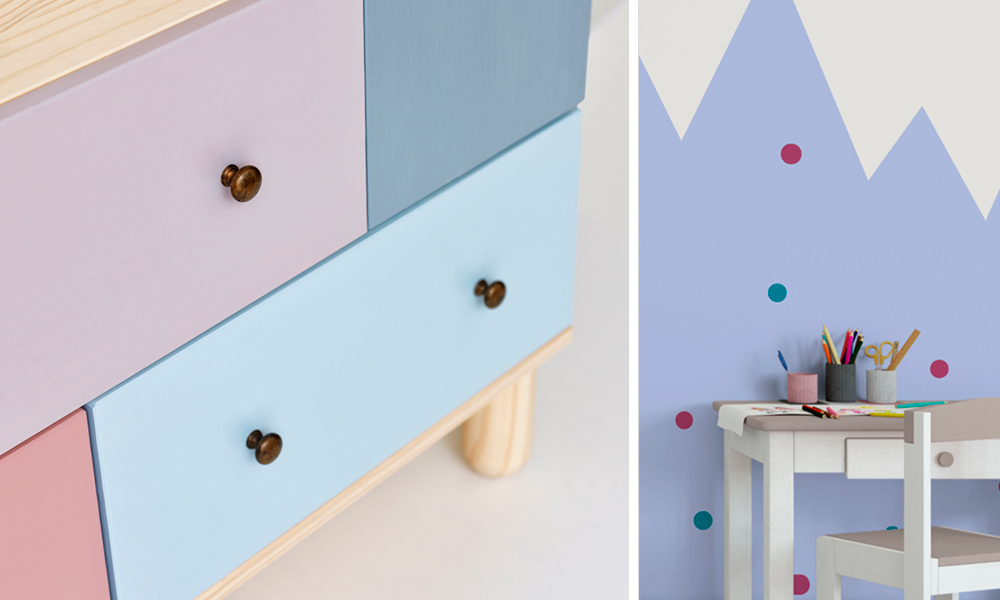 Du kan naturligvis også starte med et mindre projekt. Hvis du gerne vil hjælpe dit barn til at blive bedre tid at rydde op, kan du male skufferne på legetøjskommoden i forskellige farver – enten forskellige nuancer af samme farve eller helt forskellige farver. På den måde kan dit barn nemmere huske, hvor bilerne, dukkerne og farveblyanterne holder til.