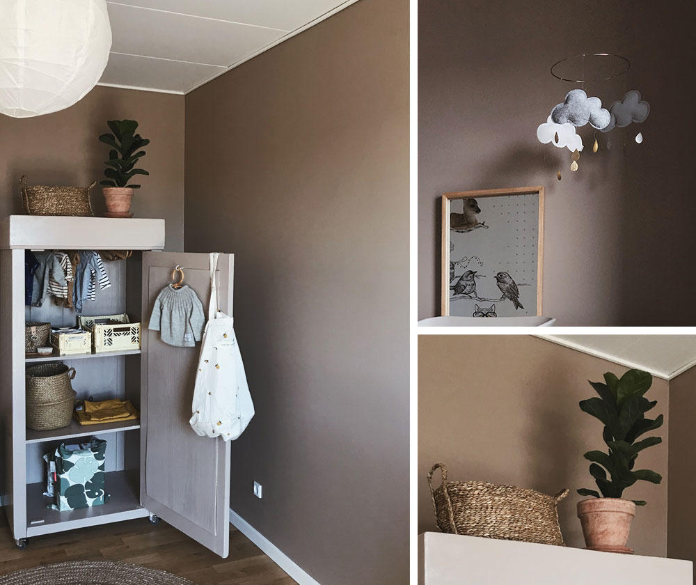 Det kan være fristende at male barneværelset i traditionelle drenge og pigefarver, som lyseblå og lyserød. Men det er ikke nødvendigvis de farver, der skaber mest ro i børneværelset. Så længe babyen er lille, er det vigtigt at børneværelset er et sted, der giver ro til forældrene, både i puslesituationer, men også når barnet skal sove. For at opnå en følelse af ro i rummet, kan du bruge afdæmpede varme farver til dette rum. Det kan f.eks. være brune nuancer. Møbler til opbevaring af tøj og legetøj kan være et loppefund eller et arvestykke, som kan males i en farve der passer til vægfarven i børneværelset. Nedenfor er skabet malet i samme farve som væggen i børneværelset. Farven hedder Cuppa Coffee.