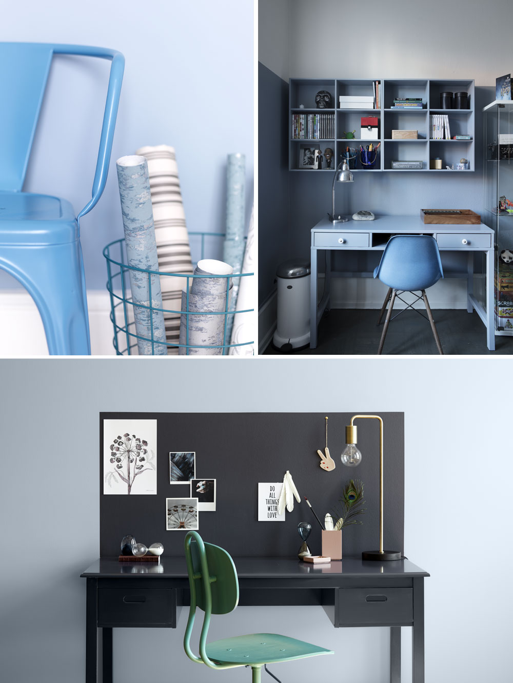 Både vægge og møbler kan males i de blå toner. Har du et skrivebord af ældre dato, kan det tilføres mange leveår endnu, ved at give det en gang maling og måske en ny farve. Hvis man vælger at arbejde med det blå tema, kan man vælge at male skrivebordet samme blå farve som væggen, men man kan også male det i en anden blå nuance, og måske male et felt på væggen over skrivebordet, som har samme farve, og dermed indrammer skrivebordspladsen.