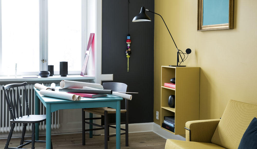 På den kreative arbejdsplads er der mulighed for at slå sig mere løs i sit farvevalg, især hvis hjemmearbejdspladsen ligger i sit eget rum. Leg med friske farver og tilsæt eventuel en neutral grå på en enkelt af væggene for at skabe balance i rummet.