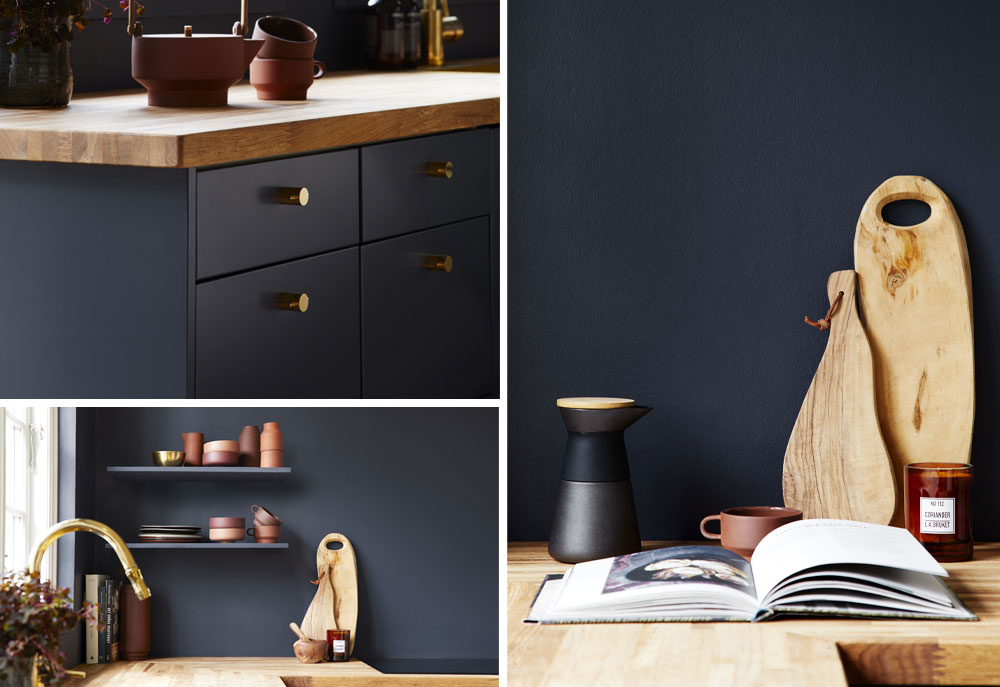 En flot mørkeblå farve som Black Flame er smuk på både køkkenlåger og vægge. Køkkenet får et flot elegant udtryk, når den blå farve bliver sammensat med tilbehør i gyldne og rødbrune farver. Vælg fx en vandhane af et gyldent metal og andet køkkentilbehør, som service og skærebrædder, i materialer af ler og træ.