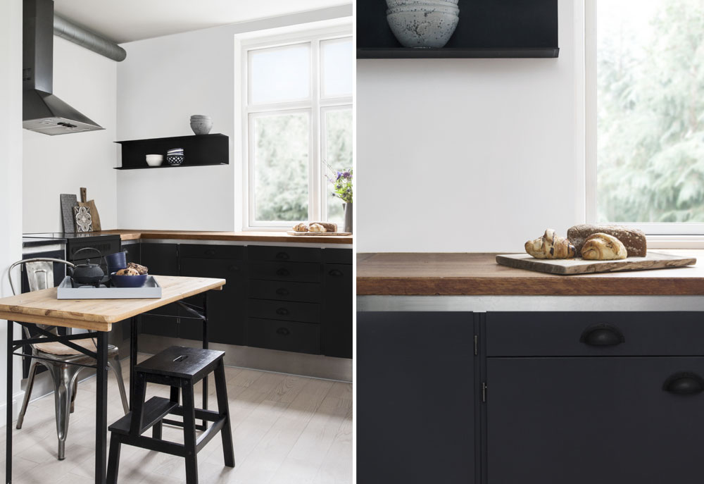 Hvis du har et gammelt køkken, som du gerne vil give en hurtig makeover, kan du male både låger og håndtag i en sort farve som Whitby Jet og hænge en hylde eller et skab på væggen, som bliver malet i samme sorte farve. For at køkkenet ikke skal blive for mørkt, har vi i køkkenet på billedet valgt at male væggen hvid med malingen Dyrup Mat & Vaskbar. Dyrup Mat & Vaskbar er en mat maling, der tåler at du tørrer den over, og selv snavs fra madlavningen, som sovs og rødvin, kan vaskes af. Hvis du synes det er for stort et projekt at male hele dit køkken kan du f.eks. starte med at male møbler som køkkenstole eller spisebord. Du kan også vælge at male køkkenlåger eller blot en enkelt endevæg. Mulighederne for at forny dit køkken med maling er mange, du skal blot have modet og inspirationen til at give dig i kast!