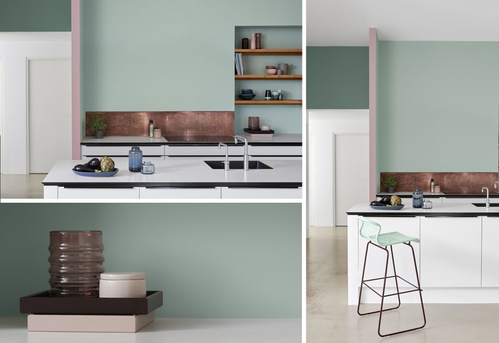Ønsker du et lyst køkken, kan du sammensætte en palet af pastelfarver. Når du sammensætter flere forskellige farver, kan du bruge dem til at fremhæve køkkenets former, f.eks. en niche eller en skillevæg, som bliver fremhævet med en matchende farve. Farverne herunder giver, sammen med kobber stænkpladen og træhylder, liv og personlighed til de hvide meget enkle elementer i køkkenet.