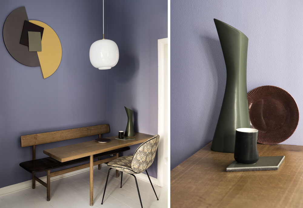 Er du ikke til pastelfarver, men mere til støvede farver, så er der heldigvis også masser af muligheder for at skabe en hyggelig stemning i køkkenet med eksempelvis en støvet lilla. Farven Violet Verbena er en smuk lys støvet lilla, som er god til at skabe ro og hygge på én gang, og farven bliver ekstra smuk, når den sættes sammen med en bordplade i en af de lidt mørkere træsorter. På billedet har ejeren af køkkenet lavet et personligt kunstværk af plader, som er malet i forskellige farver og skruet sammen til dette fine personlige kunstværk. Du kan naturligvis også gøre det mere simpelt end ovenstående kunstværk, ved at have en bordplade i en klassisk mørk træsort som teak, mahogni, bambus eller valnød. Farverne passer godt til den lilla kulør og understreger den hyggelige stemning i spisekrogen.