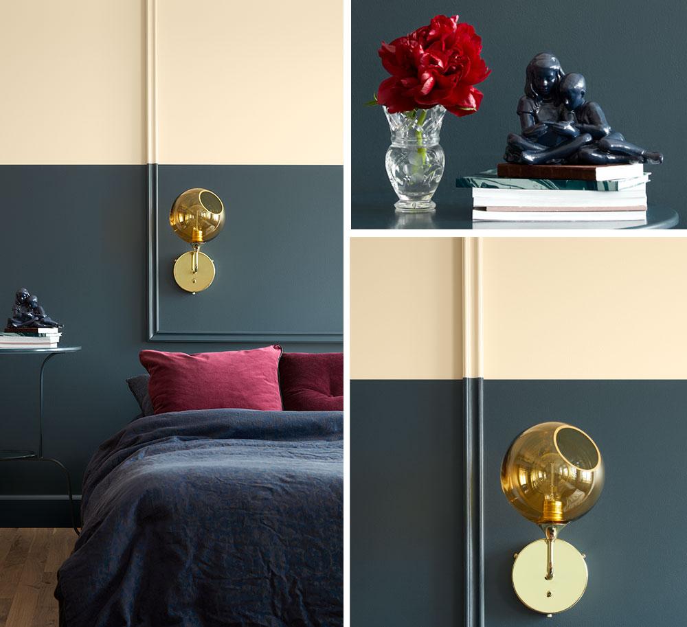 En anden måde, du kan kombinere de mørke og lyse farver, er ved at male nederste halvdel af væggen mørk og den øverste en frisk lys farve. Vi har brugt den lyse farve Scones and Cream og den mørke støvede blå Cavalry. Husk at du også kan kombinere farver i soveværelset ved at koordinere f.eks. dit interiør eller sengetøj i komplementærfarver med væggens farver. I det her tilfælde har vi malet sengebordet og porcelænsfiguren i farven Black Flame, der sammen med de dybrøde puder på sengen giver en flot og elegant hotelstil. En god måde at skabe balance med farver i soveværelset er ved at gøre brug af 60-30-10 princippet. Det er en god hjælp i forhold til at skabe en sammenhæng mellem vægge og møbler. Den rigtige vægtning og kombination af farver kan forvandle dit soveværelse, og give dig en god oplevelse, både før du skal sove, og når du vågner.