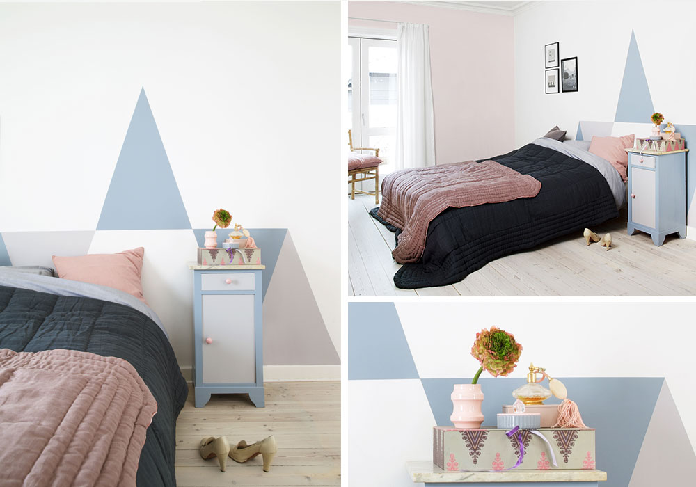Hvis du er en af dem, som sværger til et koldt soverum, så er det måske de helt kolde farver, som du skal male med i dit soveværelse, da kolde farver får vores hjerner til at synes, at der er køligt i rummet. I soveværelset her på billederne er der brugt de helt lyse farver Ceto og Gray Shadows til at male et enkelt geometrisk mønster på væggen, mens væggen ved siden af sengen er malet med den helt lyse Raspberry Milk. Farvene fra væggene er samtidig brugt på det lille antikke skab for at skabe sammenhæng i rummet. Læs mere her om, hvordan du maler møbler og loppefund.