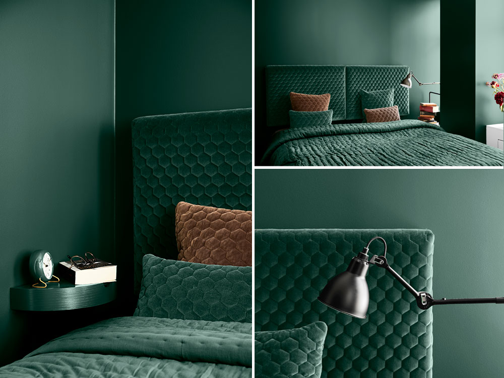 Hvis du er til hulestemning i dit soveværelse kan de mørke juvelinspirerede farver være med til at give denne stemning i rummet. Her er der brugt den mørkegrønne farve Quiet Clearing, som er kombineret med gyldne brune puder og mørkerøde Blomster.