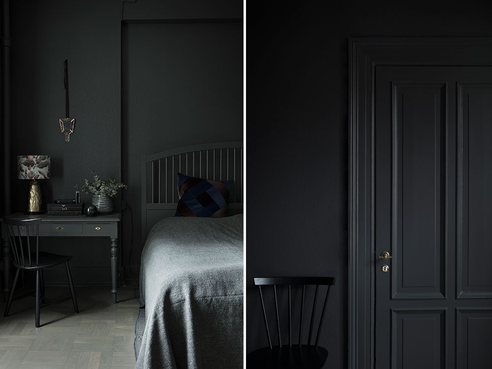 Mørkegrå farver i soveværelset kan være med til at forstærke mørket i rummet, da nogen mennesker har brug for at der er helt mørkt, når de skal sove. Du kan vælge at gå hele vejen og male både vægge, paneler og møbler i den samme mørke farve, som her på billederne, hvor den mørke stemning understreges yderligere med sengetæpper og gardiner i samme mørke grå. Farven som møbler, vægge og paneler er malet med er: Black Widow.