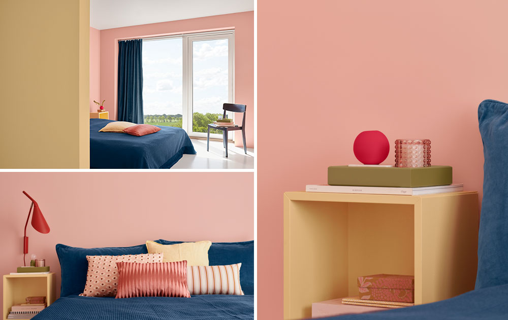 Hvis du ikke har brug for at dit soveværelse giver en bestemt følelse eller stemning, men du bare vil have rummet til at passe til resten af hjemmet, så er det bare at give dig i kast med de farver, som du kan lide, og måske i forvejen bruges i dit hjem. Hvis du sørger for at farverne fra de forskellige rum passer sammen, får du nemt en flot sammenhæng mellem hjemmets rum. På billederne her er der brugt den gule farve LA Heart i entréen, som passer med den lyserøde farve Sweet Sheba i soveværelset. Samtidig går den gule farve fra entréen igen på bogkasserne i soveværelset, som er brugt som natborde. Ved at lade farverne gå igen fra rum til rum på denne måde får man let en flot sammenhængende stil i hjemmet.