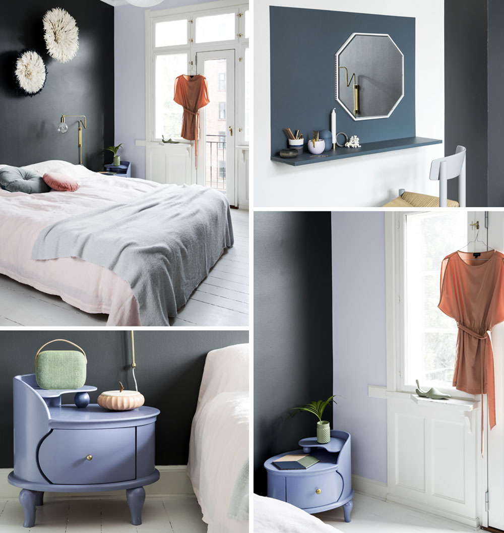 Hvis du synes det helt mørke rum er en tand for meget, men stadig ønsker en grå farve i dit soveværelse, så kan du nøjes med at male en enkelt væg i en mørkegrå farve og så male de andre vægge i en lys farve. Her er væggen bag sengen er malet i den grå farve Midnight Ocean, mens den tilstødende væg er malet i den helt sarte lyserøde Violet Whimsey. Sengebordet er malet med farven Violet Verbena.