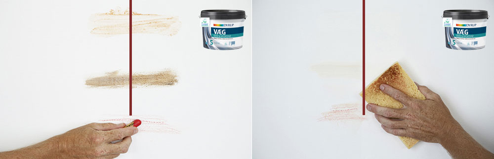 Som det fremgår af billederne, er forskellen ikke til at tage fejl af. Hvis du skal male i et rum, hvor der er risiko for, at væggene bliver beskidte, er det derfor en god idé at vælge en vaskbar maling.