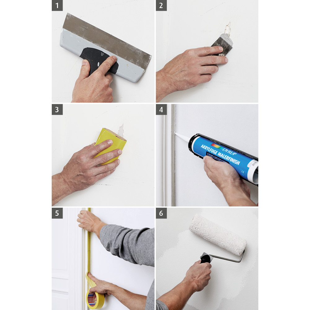 Inden du begynder at male dine vægge er det en god idé at fuge med en akrylfuge langs paneler, karme og hvis nødvendigt langs loftet. Se her hvordan du fuger. Når fugerne er tørre er du klar til at grunde, så malingen på væggen hæfter ordentligt.